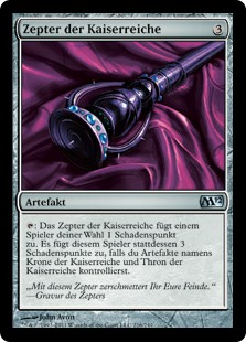 | Rules | : Scepter of Empires deals 1 damage to target player or planeswalker. It deals 3 damage instead if you control artifacts named Crown of Empires and Throne of Empires. |