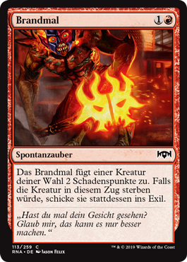 | Rules | Scorchmark deals 2 damage to target creature. If that creature would die this turn, exile it instead. |