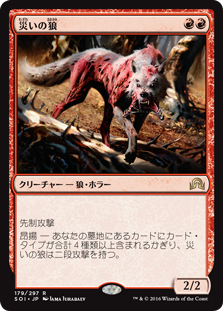 Delirium — Scourge Wolf has double strike as long as there are four or more card types among cards in your graveyard.