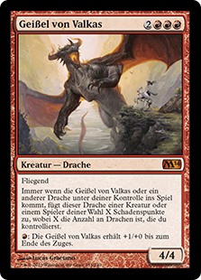 | Rules | Flying Whenever Scourge of Valkas or another Dragon enters the battlefield under your control, it deals X damage to any target, where X is the number of Dragons you control. : Scourge of Valkas gets +1/+0 until end of turn. |