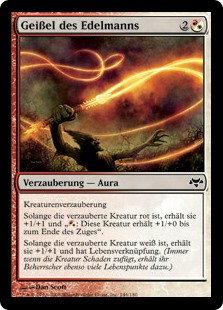 | Rules | Enchant creature As long as enchanted creature is red, it gets +1/+1 and has ": This creature gets +1/+0 until end of turn." As long as enchanted creature is white, it gets +1/+1 and has lifelink. (Damage dealt by the creature also causes its controller to gain that much life.) |