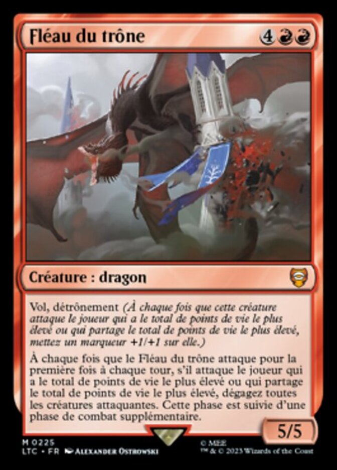 | Rules | Flying Dethrone (Whenever this creature attacks the player with the most life or tied for most life, put a +1/+1 counter on it.) Whenever Scourge of the Throne attacks for the first time each turn, if it's attacking the player with the most life or tied for most life, untap all attacking creatures. After this phase, there is an additional combat phase. |