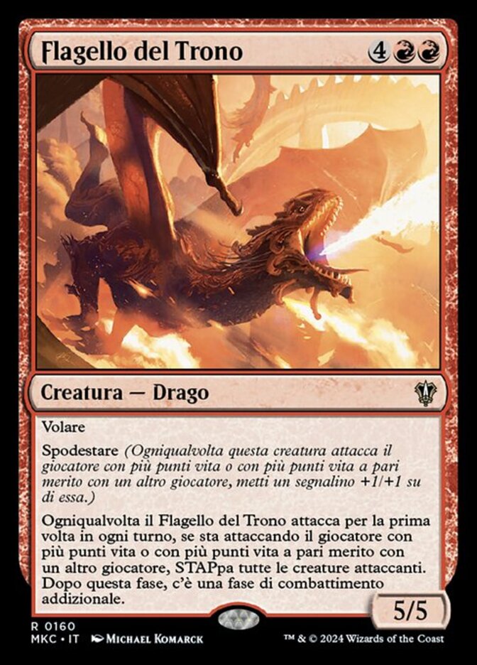 | Rules | Flying Dethrone (Whenever this creature attacks the player with the most life or tied for most life, put a +1/+1 counter on it.) Whenever Scourge of the Throne attacks for the first time each turn, if it's attacking the player with the most life or tied for most life, untap all attacking creatures. After this phase, there is an additional combat phase. |
