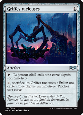 | Rules | : Target player exiles a card from their graveyard. , Sacrifice Scrabbling Claws: Exile target card from a graveyard. Draw a card. |