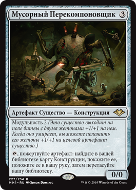 | Rules | Modular 2 (This creature enters the battlefield with two +1/+1 counters on it. When it dies, you may put its +1/+1 counters on target artifact creature.) , Sacrifice an artifact: Search your library for a Construct card, reveal it, put it into your hand, then shuffle. |