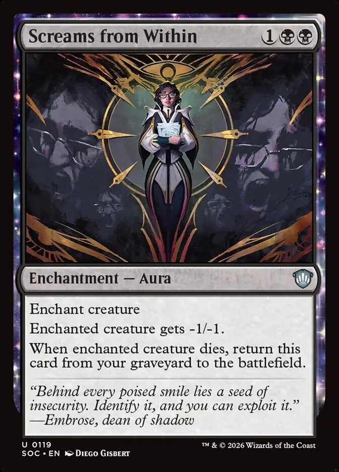 | Rules | Enchant creature Enchanted creature gets -1/-1. When enchanted creature dies, return Screams from Within from your graveyard to the battlefield. |