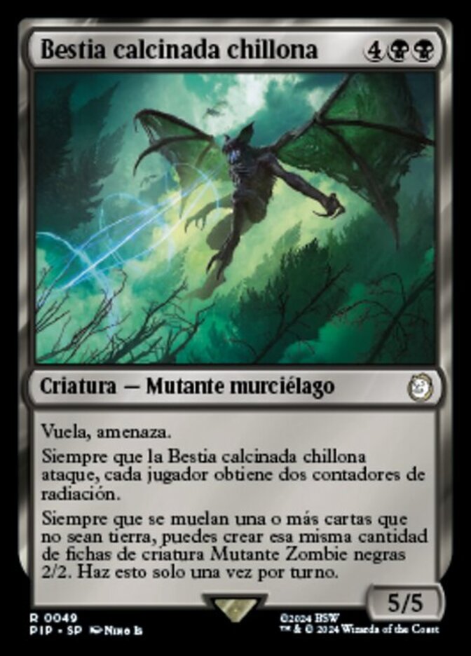 | Rules | Flying, menace Whenever Screeching Scorchbeast attacks, each player gets two rad counters. Whenever one or more nonland cards are milled, you may create that many 2/2 black Zombie Mutant creature tokens. Do this only once each turn. |