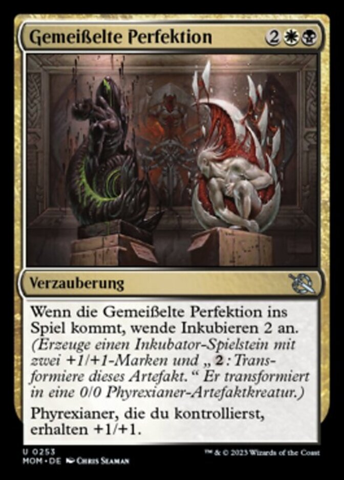 | Rules | When Sculpted Perfection enters the battlefield, incubate 2. (Create an Incubator token with two +1/+1 counters on it and ": Transform this artifact." It transforms into a 0/0 Phyrexian artifact creature.) Phyrexians you control get +1/+1. |