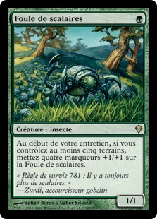 | Rules | At the beginning of your upkeep, if you control five or more lands, put four +1/+1 counters on Scute Mob. |