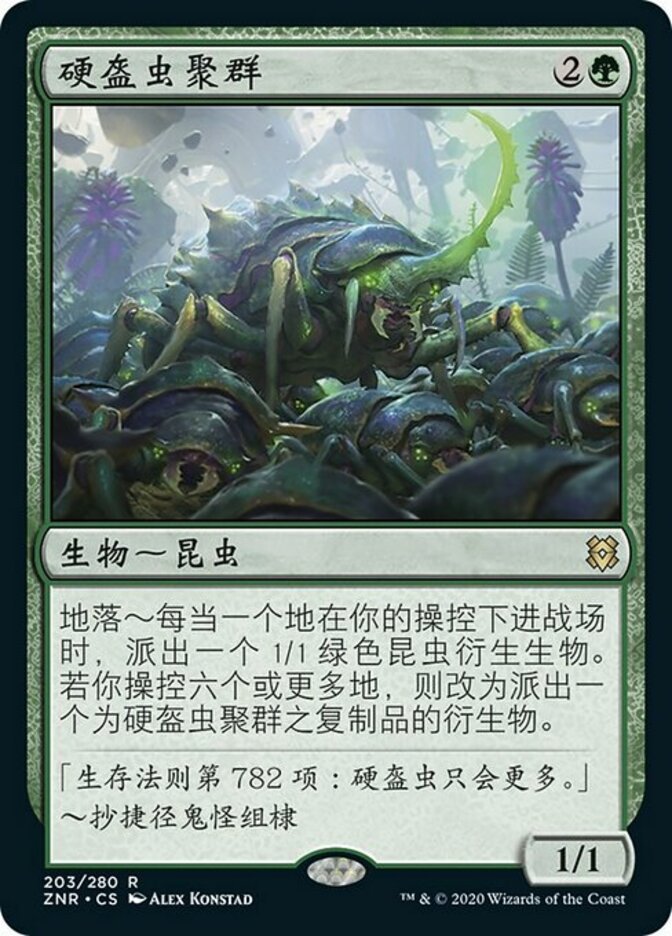 | Rules | Landfall — Whenever a land enters the battlefield under your control, create a 1/1 green Insect creature token. If you control six or more lands, create a token that's a copy of Scute Swarm instead. |