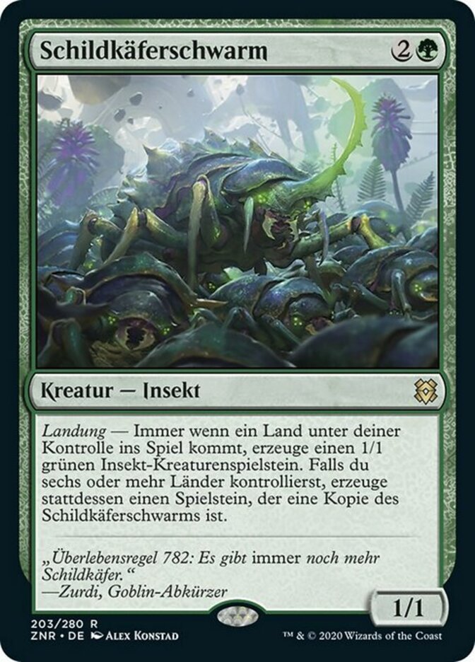 | Rules | Landfall — Whenever a land enters the battlefield under your control, create a 1/1 green Insect creature token. If you control six or more lands, create a token that's a copy of Scute Swarm instead. |