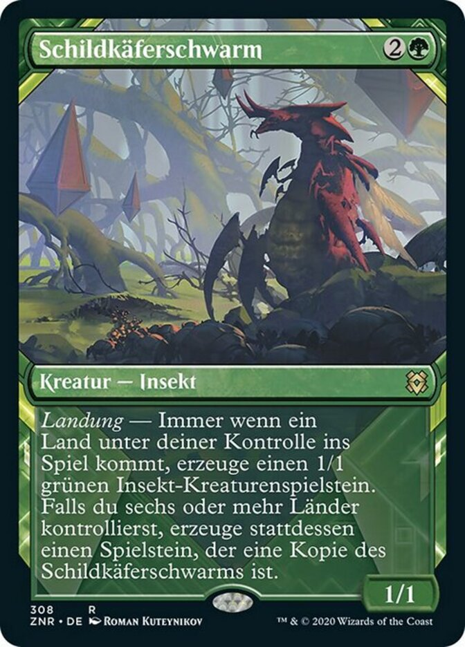 | Rules | Landfall — Whenever a land enters the battlefield under your control, create a 1/1 green Insect creature token. If you control six or more lands, create a token that's a copy of Scute Swarm instead. |