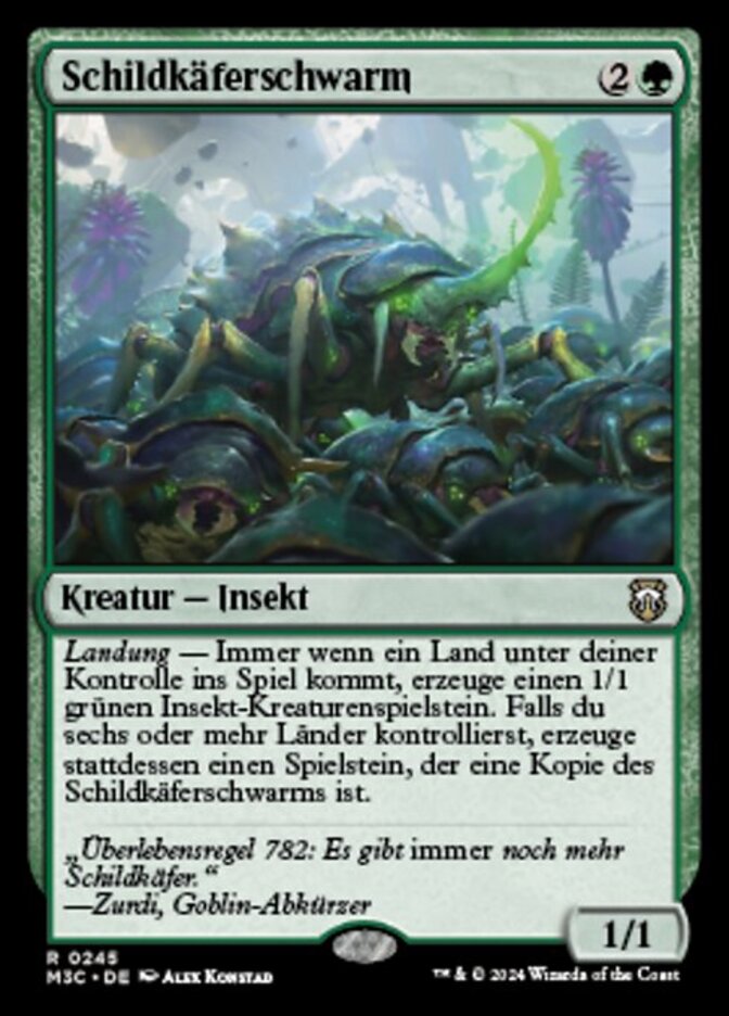 | Rules | Landfall — Whenever a land enters the battlefield under your control, create a 1/1 green Insect creature token. If you control six or more lands, create a token that's a copy of Scute Swarm instead. |