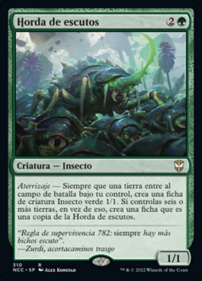 | Rules | Landfall — Whenever a land enters the battlefield under your control, create a 1/1 green Insect creature token. If you control six or more lands, create a token that's a copy of Scute Swarm instead. |