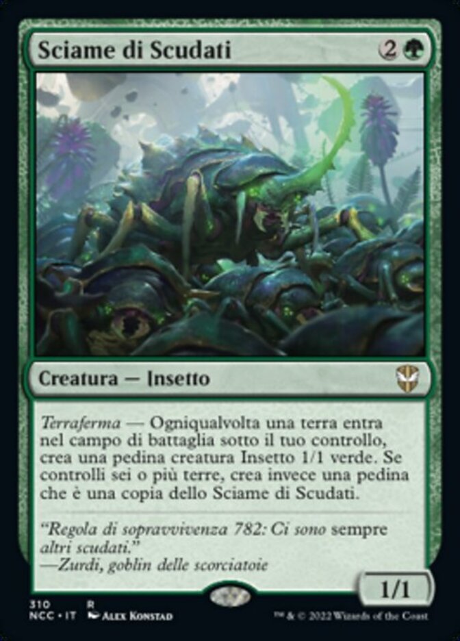 | Rules | Landfall — Whenever a land enters the battlefield under your control, create a 1/1 green Insect creature token. If you control six or more lands, create a token that's a copy of Scute Swarm instead. |
