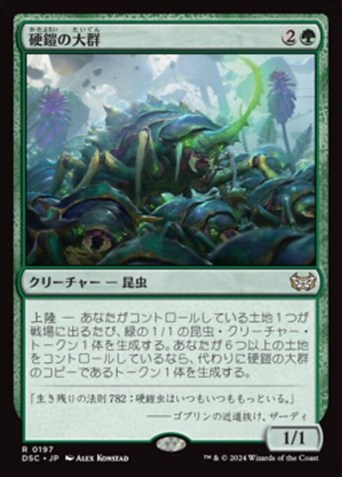| Rules | Landfall — Whenever a land enters the battlefield under your control, create a 1/1 green Insect creature token. If you control six or more lands, create a token that's a copy of Scute Swarm instead. |