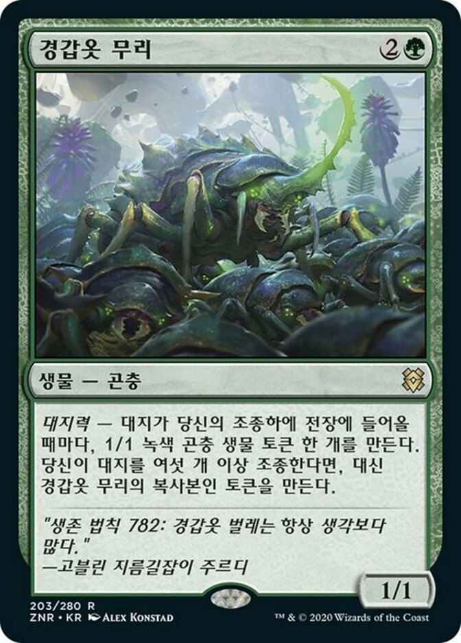 | Rules | Landfall — Whenever a land enters the battlefield under your control, create a 1/1 green Insect creature token. If you control six or more lands, create a token that's a copy of Scute Swarm instead. |