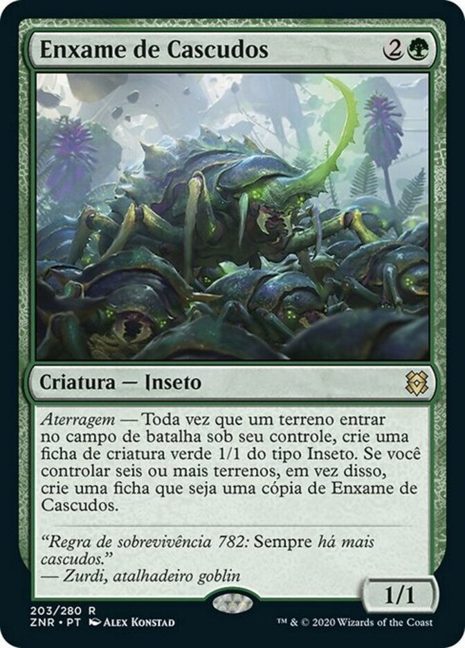 | Rules | Landfall — Whenever a land enters the battlefield under your control, create a 1/1 green Insect creature token. If you control six or more lands, create a token that's a copy of Scute Swarm instead. |