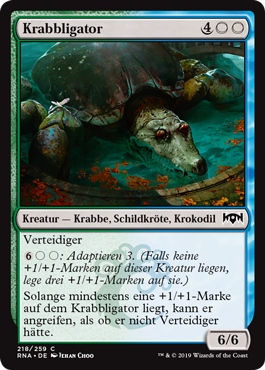 | Rules | Defender : Adapt 3. (If this creature has no +1/+1 counters on it, put three +1/+1 counters on it.) As long as Scuttlegator has a +1/+1 counter on it, it can attack as though it didn't have defender. |