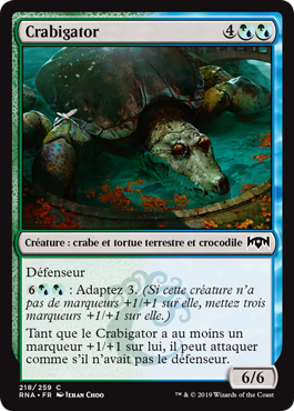 | Rules | Defender : Adapt 3. (If this creature has no +1/+1 counters on it, put three +1/+1 counters on it.) As long as Scuttlegator has a +1/+1 counter on it, it can attack as though it didn't have defender. |