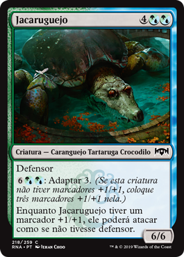 | Rules | Defender : Adapt 3. (If this creature has no +1/+1 counters on it, put three +1/+1 counters on it.) As long as Scuttlegator has a +1/+1 counter on it, it can attack as though it didn't have defender. |