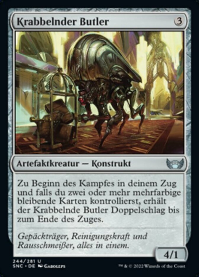 | Rules | At the beginning of combat on your turn, if you control two or more multicolored permanents, Scuttling Butler gains double strike until end of turn. |