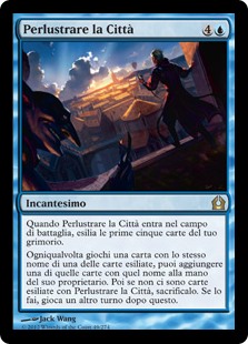 | Rules | When Search the City enters the battlefield, exile the top five cards of your library. Whenever you play a card with the same name as one of the exiled cards, you may put one of those cards with that name into its owner's hand. Then if there are no cards exiled with Search the City, sacrifice it. If you do, take an extra turn after this one. |