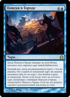 | Rules | When Search the City enters the battlefield, exile the top five cards of your library. Whenever you play a card with the same name as one of the exiled cards, you may put one of those cards with that name into its owner's hand. Then if there are no cards exiled with Search the City, sacrifice it. If you do, take an extra turn after this one. |