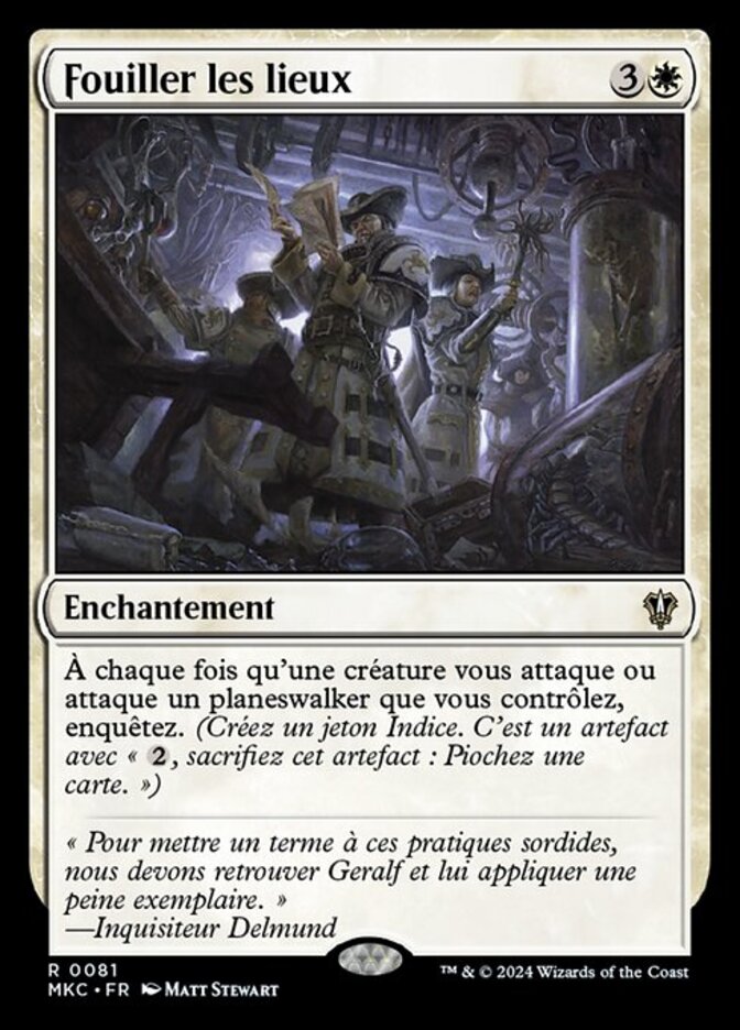 | Rules | Whenever a creature attacks you or a planeswalker you control, investigate. (Create a colorless Clue artifact token with ", Sacrifice this artifact: Draw a card.") |
