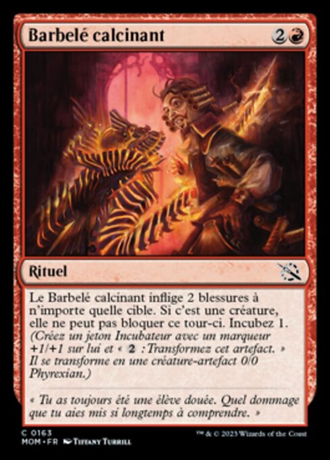 | Rules | Searing Barb deals 2 damage to any target. If it's a creature, it can't block this turn. Incubate 1. (Create an Incubator token with a +1/+1 counter on it and ": Transform this artifact." It transforms into a 0/0 Phyrexian artifact creature.) |