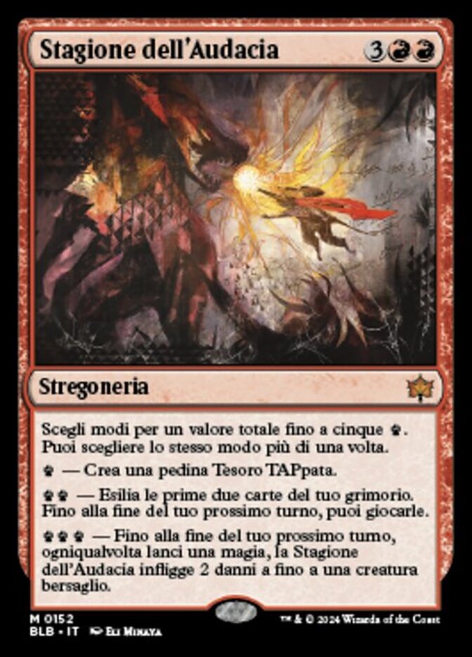 | Rules | Choose up to five worth of modes. You may choose the same mode more than once. — Create a tapped Treasure token. — Exile the top two cards of your library. Until the end of your next turn, you may play them. — Until the end of your next turn, whenever you cast a spell, Season of the Bold deals 2 damage to up to one target creature. |