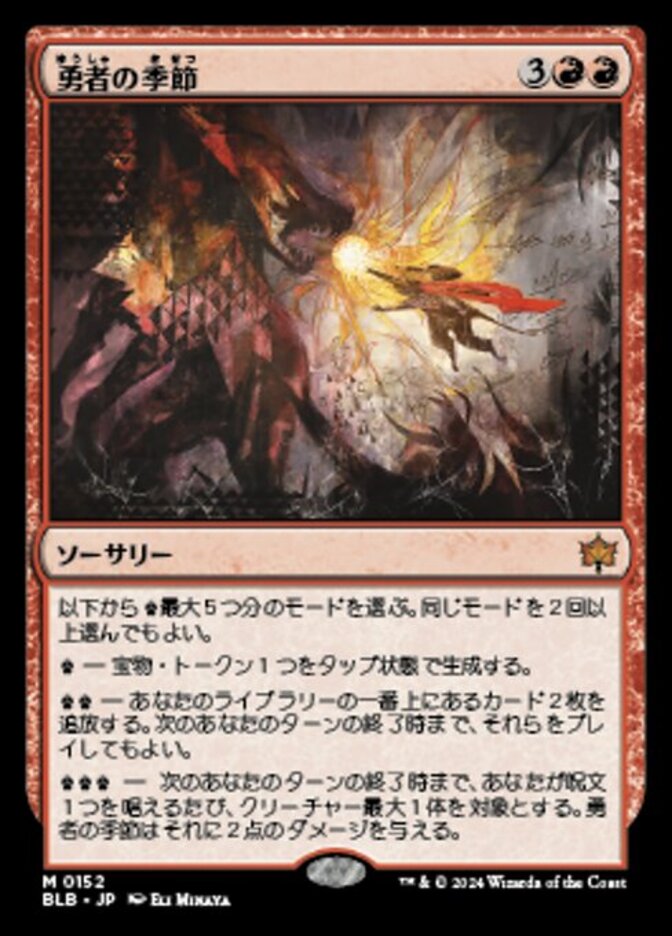 | Rules | Choose up to five worth of modes. You may choose the same mode more than once. — Create a tapped Treasure token. — Exile the top two cards of your library. Until the end of your next turn, you may play them. — Until the end of your next turn, whenever you cast a spell, Season of the Bold deals 2 damage to up to one target creature. |
