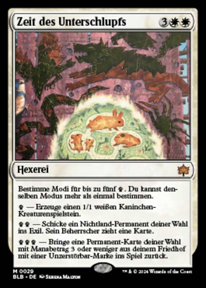| Rules | Choose up to five worth of modes. You may choose the same mode more than once. — Create a 1/1 white Rabbit creature token. — Exile target nonland permanent. Its controller draws a card. — Return target permanent card with mana value 3 or less from your graveyard to the battlefield with an indestructible counter on it. |