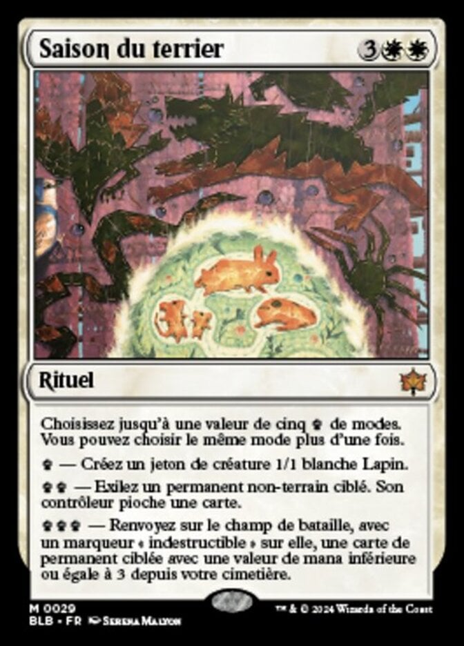 | Rules | Choose up to five worth of modes. You may choose the same mode more than once. — Create a 1/1 white Rabbit creature token. — Exile target nonland permanent. Its controller draws a card. — Return target permanent card with mana value 3 or less from your graveyard to the battlefield with an indestructible counter on it. |
