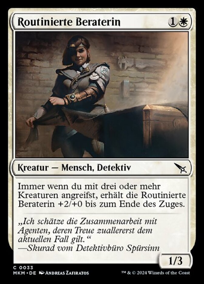 | Rules | Whenever you attack with three or more creatures, Seasoned Consultant gets +2/+0 until end of turn. |