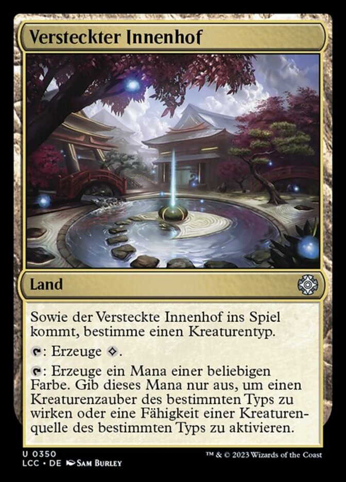 | Rules | As Secluded Courtyard enters the battlefield, choose a creature type. : Add . : Add one mana of any color. Spend this mana only to cast a creature spell of the chosen type or activate an ability of a creature or creature card of the chosen type. |