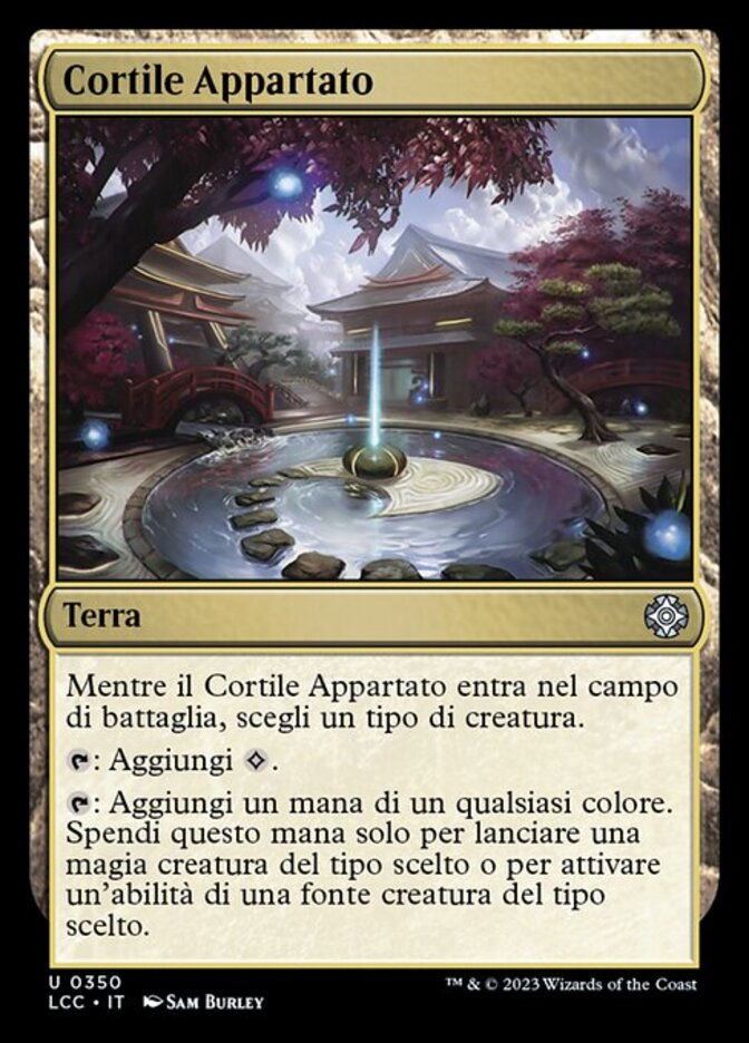 | Rules | As Secluded Courtyard enters the battlefield, choose a creature type. : Add . : Add one mana of any color. Spend this mana only to cast a creature spell of the chosen type or activate an ability of a creature or creature card of the chosen type. |