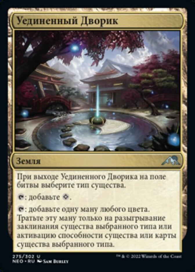| Rules | As Secluded Courtyard enters the battlefield, choose a creature type. : Add . : Add one mana of any color. Spend this mana only to cast a creature spell of the chosen type or activate an ability of a creature or creature card of the chosen type. |