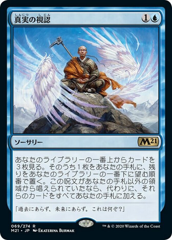 | Rules | Look at the top three cards of your library. Put one of those cards into your hand and the rest on the bottom of your library in any order. If this spell was cast from anywhere other than your hand, put each of those cards into your hand instead. |