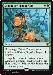 | Rules | Undaunted (This spell costs less to cast for each opponent.) Return up to two target cards from your graveyard to your hand. Exile Seeds of Renewal. |