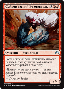 | Rules | When Seismic Elemental enters the battlefield, creatures without flying can't block this turn. |