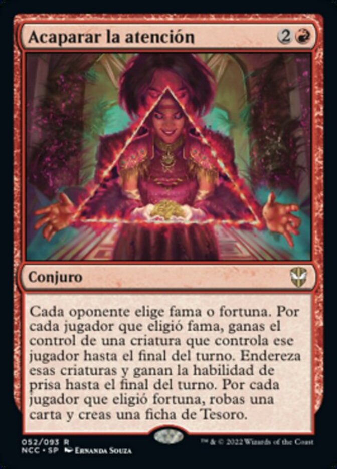 Rules Each opponent choses fame or fortune. For each player who chose fame, gain control of a creature that player controls until end of turn. Untap those creatures and they gain haste until end of turn. For each player who chose fortune, you draw a card and create a Treasure token.