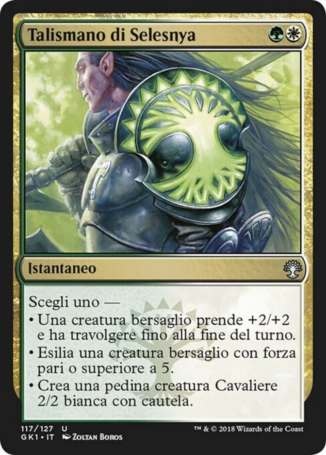 | Rules | Choose one — • Target creature gets +2/+2 and gains trample until end of turn. • Exile target creature with power 5 or greater. • Create a 2/2 white Knight creature token with vigilance. |