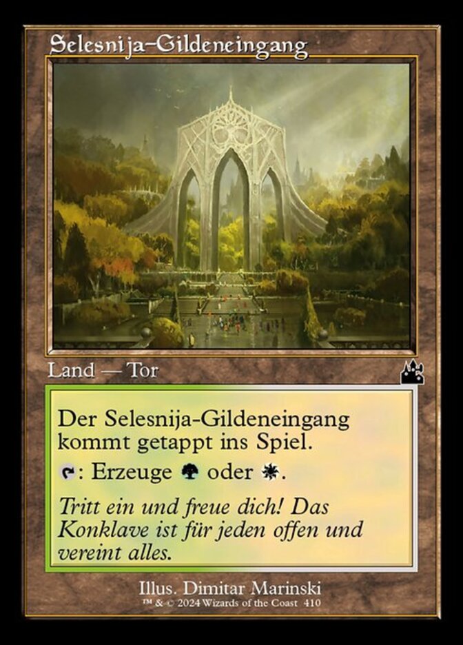 | Rules | Selesnya Guildgate enters the battlefield tapped. : Add or . |