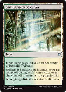 | Rules | Selesnya Sanctuary enters the battlefield tapped. When Selesnya Sanctuary enters the battlefield, return a land you control to its owner's hand. : Add . |