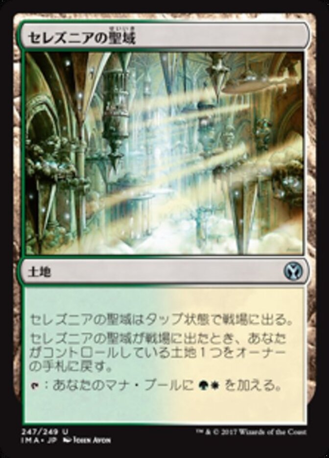 | Rules | Selesnya Sanctuary enters the battlefield tapped. When Selesnya Sanctuary enters the battlefield, return a land you control to its owner's hand. : Add . |