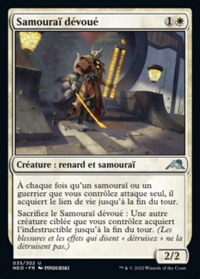 | Rules | Whenever a Samurai or Warrior you control attacks alone, it gains lifelink until end of turn. Sacrifice Selfless Samurai: Another target creature you control gains indestructible until end of turn. (Damage and effects that say "destroy" don't destroy it.) |