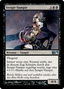 | Rules | Flying (This creature can't be blocked except by creatures with flying or reach.) Whenever a creature dealt damage by Sengir Vampire this turn dies, put a +1/+1 counter on Sengir Vampire. |