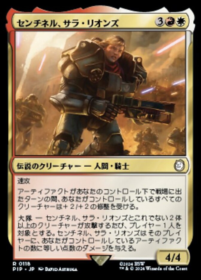 | Rules | Haste As long as an artifact entered the battlefield under your control this turn, creatures you control get +2/+2. Battalion — Whenever Sentinel Sarah Lyons and at least two other creatures attack, Sentinel Sarah Lyons deals damage equal the number of artifacts you control to target player. |