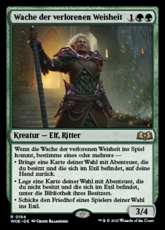 | Rules | When Sentinel of Lost Lore enters the battlefield, choose one or more — • Return target card you own in exile that has an Adventure to your hand. • Put target card you don't own in exile that has an Adventure on the bottom of its owner's library. • Exile target player's graveyard. |
